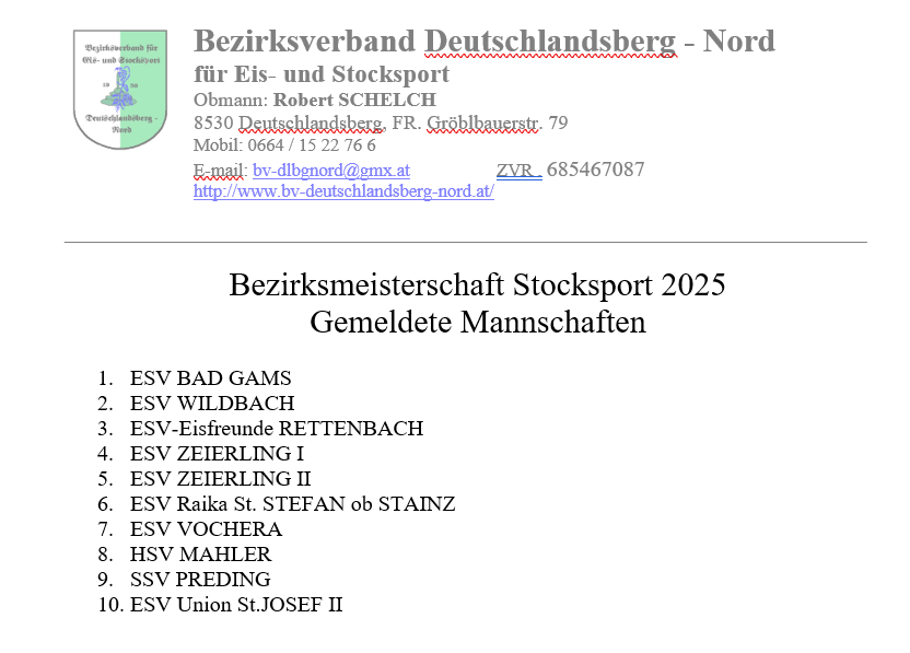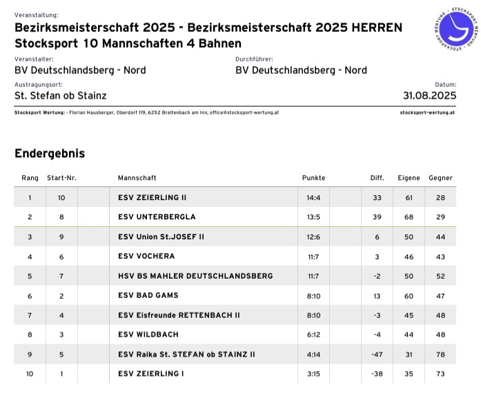 Am Sonntag den 31.August 2025 fand die Bezirksmeisterschaft der HERREN im Stocksport statt. 10 Mannschaften nahmen daran teil. Nach spannenden Spielen und Spannung bis zum letzten Durchgang standen die beiden Aufsteiger zur Gebietsmeisterschaft am 06. bzw. 07. September 2025 fest. Der Bezirksverband gratuliert dem ESV ZEIERLING II zum Bezirksmeistertitel 2025 und zum Aufstieg zur Gebietsmeisterschaft am 06. September 2025 in MURBERG. Ebenfalls recht herzliche Gratulation an den Vizebezirksmeister 2025 ESV UNTERBERGLA und zum Aufstieg zur Gebietsmeisterschaft am 07. September 2025 in HOHENBURG. Ein herzliches Dankeschön an Paul und Peter Wippel für die Durchführung der Meisterschaft und an den Obmann des ESV St. STEFAN ob Stainz für die zur Verfügung Stellung der Halle.