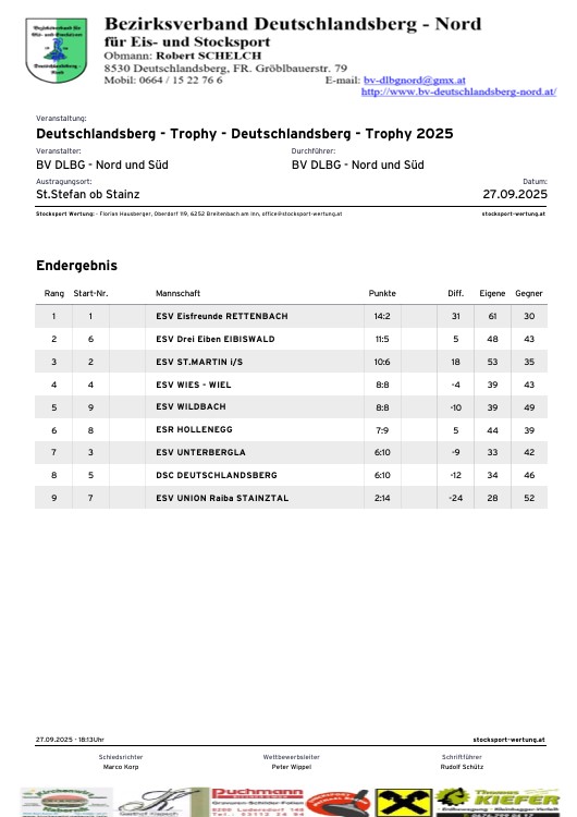 Am Samstag den 27.September 2025 fand in St.Stefan ob Stainz die diesjährige Deutschlandsberg – Trophy statt. Da die Halle in Kalkgrub heuer nicht zur Verfügung stand und die Anlage in St. Stefan ob Stainz nur über vier Bahnen verfügt, kämpften heuer nur neun Mannschaften um die Deutschlandsberg – Tropy. Da der ESV Eisfreunde RETTENBACH im Vorjahr die Trophy gewonnen hatte, konnte der BV DLBG – Nord fünf Mannschaften stellen. Nach spannenden und fairen Spielen konnte der ESV Eisfreunde RETTENBACH den Titel vereidigen und wieder in den Norden holen. Die weiteren Stockerlplätze holte sich aber der BV DLBG – Süd mit den ESV Drei Eiben EIBISWALD als zweit – und ESV St. MARTIN i/S als drittplatzierte. Ein großes Dankeschön geht an den Veranstalter den ESV St.Stefan ob Stainz für die tolle Bewirtung, den Schiedsrichter Marco KORP und den Pressereferenten Alois Rumpf. Mit der Siegerehrung und schönen Grußworten des Bürgermeisters von St.Stefan ob Stainz Herrn Stephan Oswald ging eine tolle Veranstaltung zu Ende.