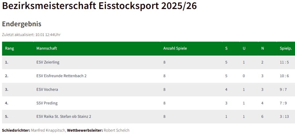 Am Samstag fand in der Eishalle in St.Martin i/S die Bezirksmeisterschaft Eisstocksport 2024 des Bezirksverbandes Deutschlandsberg-Nord für Eis u.Stocksport statt. Auf Grund der geringen Teilnehmerzahl (nur vier Mannschaften haben gemeldet) wurde ein Doppeldurchgang gespielt. Dadurch wurde der Charakter einer Meisterschaft gewahrt.